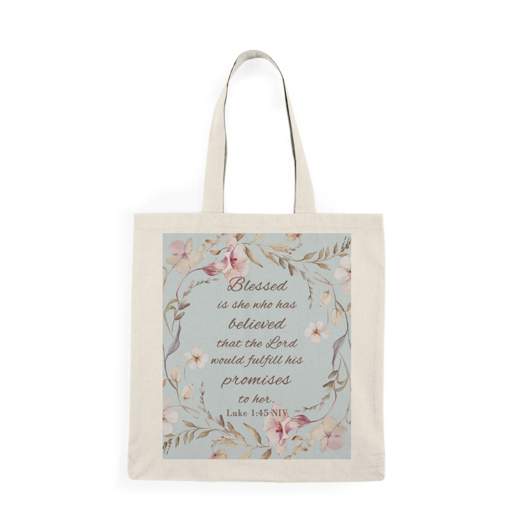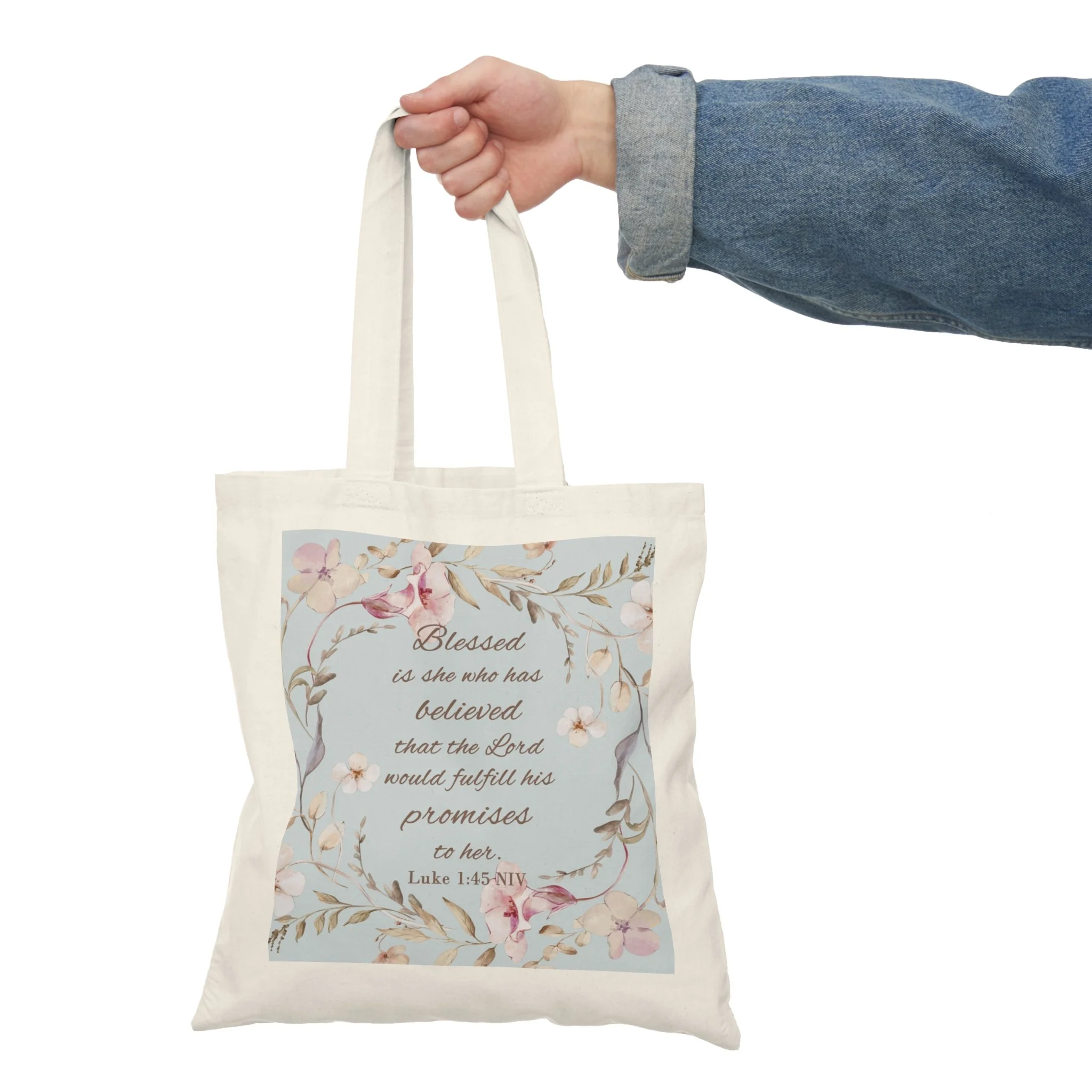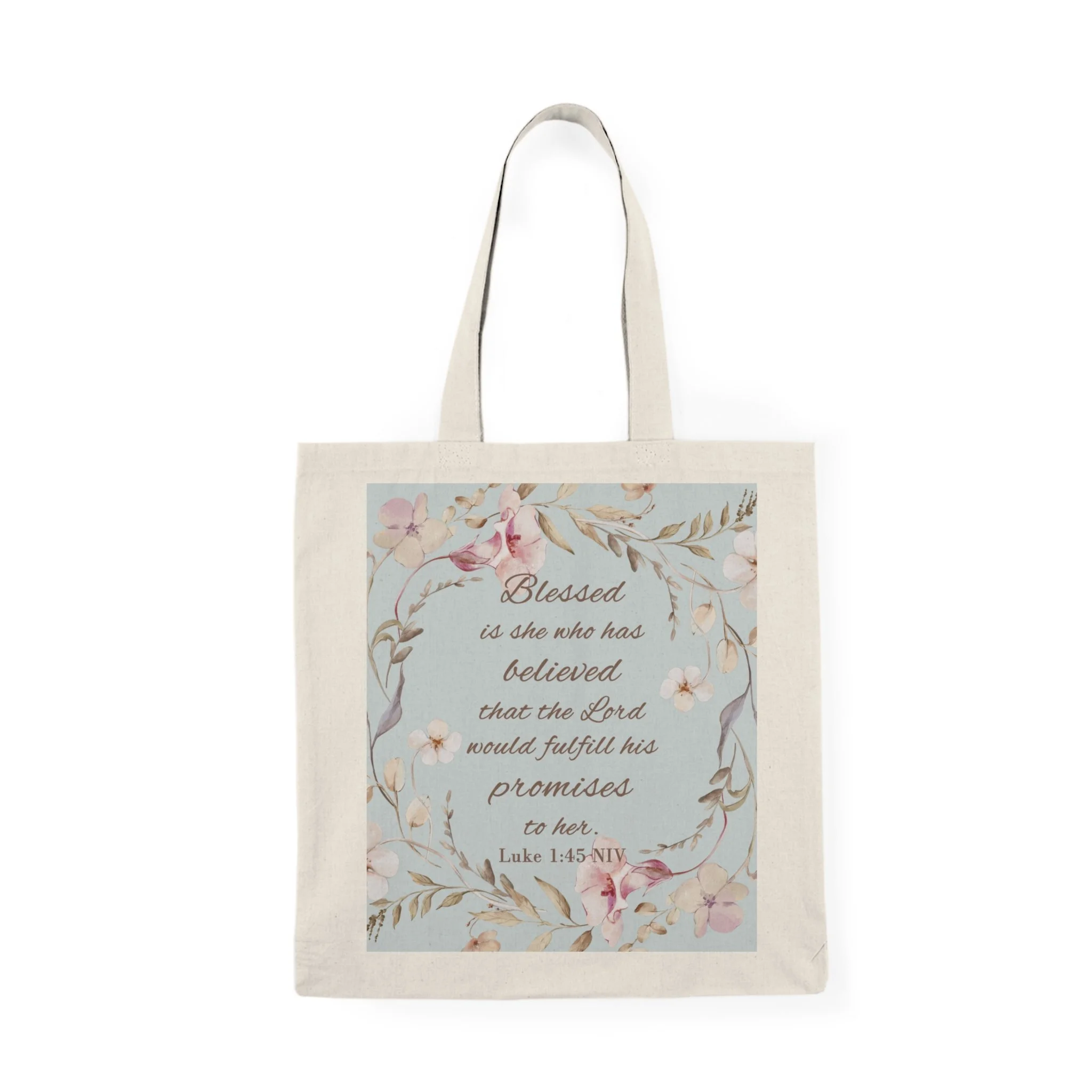 Soft cotton canvas carries a quiet, steady message. This tote pairs gentle floral artwork with a favorite Bible verse, folding faith into everyday practice. The blossoms feel like a slow breath—soft petals around a line of scripture—so your errands, church nights, and reflective walks are threaded with calm. It sits easily over your shoulder, holds a Bible or market haul without fuss, and reads like a small, wearable prayer that travels with you to community gatherings, study groups, or peaceful mornings at the café.